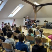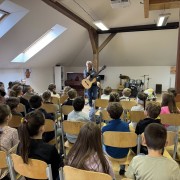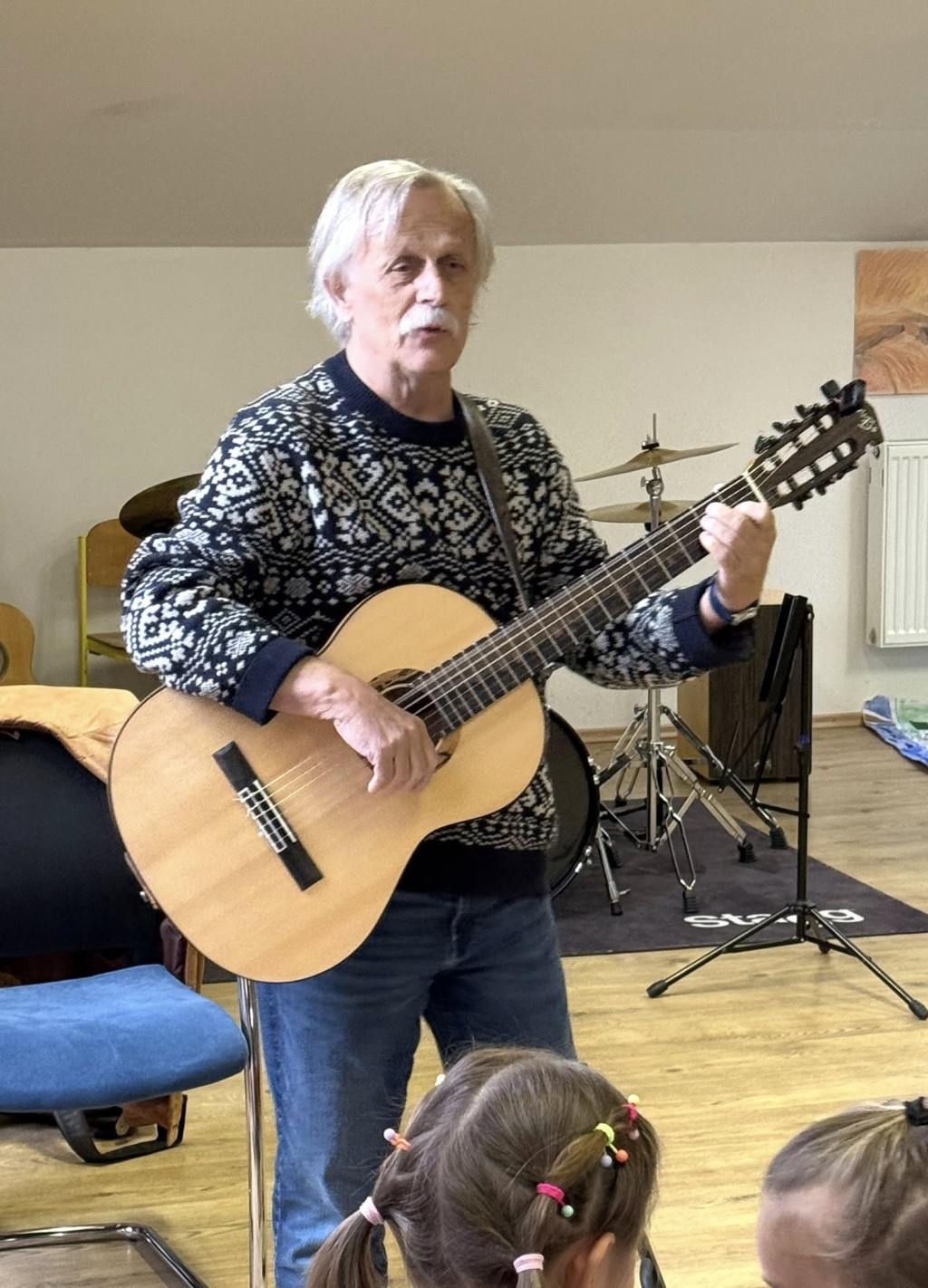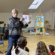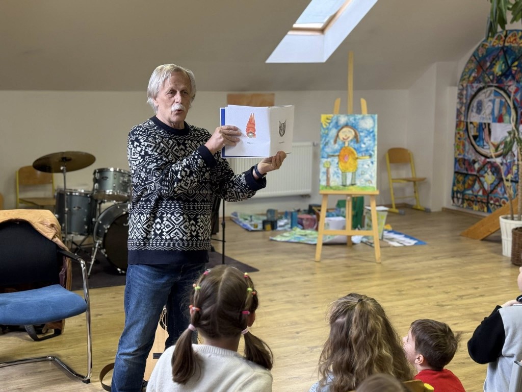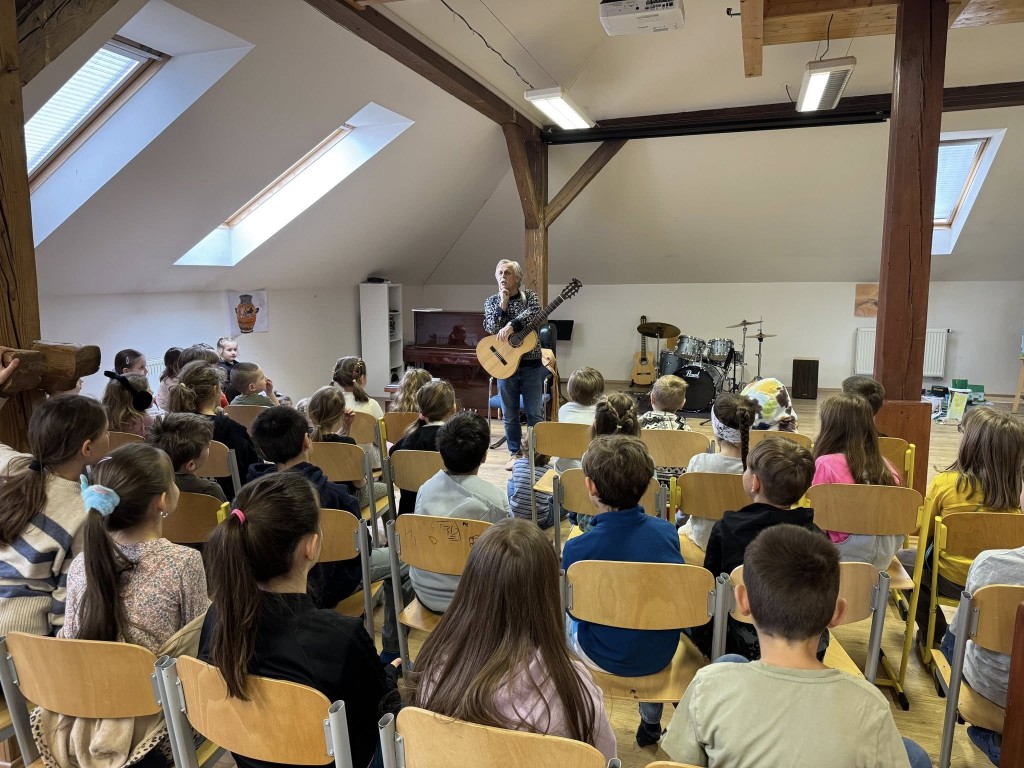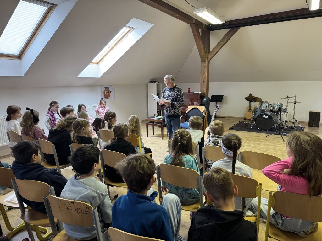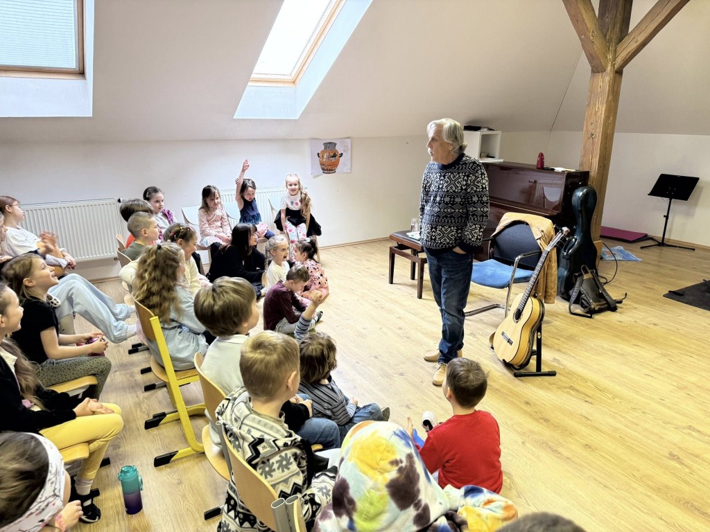 Mladší děti si setkání užily především díky jeho pohádkám, humoru a písničkám. Se staršími žáky diskutoval o historii, protestsongu a období komunistického režimu.